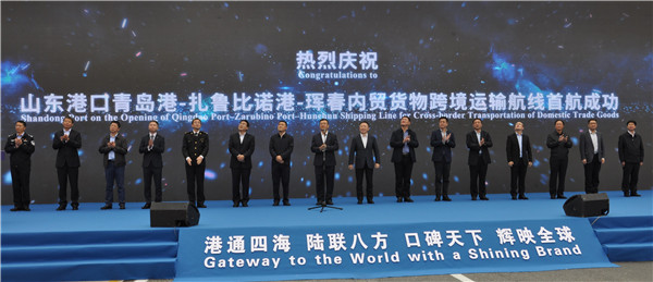 仪式上,青岛港党委书记、董事长贾福宁致辞,珲春市张吉峰市长视频致辞。山东省港口集团党委副书记、董事、总经理李奉利宣布首航正式启动。青岛海关、山东海事局、青岛市交通运输局、青岛市商务局、青岛市政府外事办、青岛市政府口岸办、西海岸新区管委、山东省港口集团、青岛港集团等单位相关领导出席。青岛港党委副书记、总经理苏建光主持仪式。