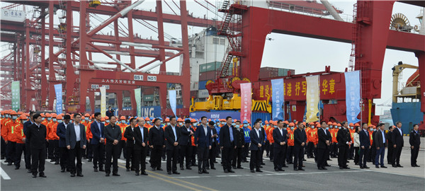 5月15日上午10 点18 分,青岛港-扎鲁比诺港-珲春内贸货物跨境运输航线首航庆祝仪式在青岛前湾集装箱码头举行。市侨联主席崔作应邀出席。