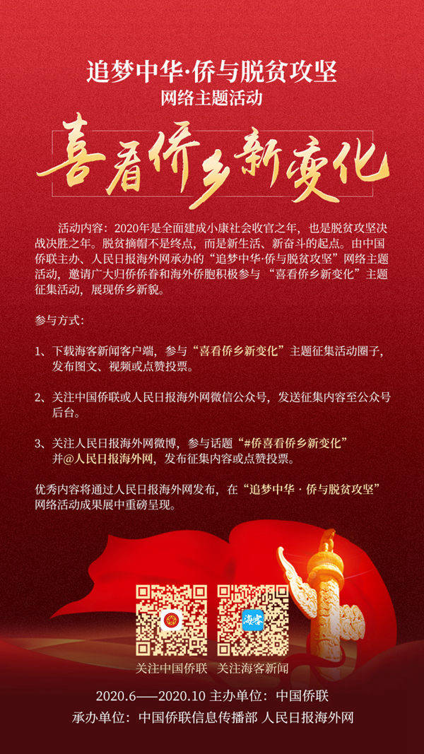 参与者可通过下载海客新闻客户端或关注“人民日报海外版海外网”微博、“海外网” 微信公众号,以及登录中国侨联官网、关注“中国侨联”微信公众号,参与话题“#喜看侨乡新变化#”、“#侨界脱贫攻坚图片故事#”等话题,说出身边的脱贫攻坚奔小康故事,将侨助脱贫攻坚的声音远播四海。