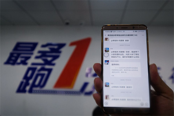 6月12日,青田县行政服务中心工作人员展示手机上的涉侨审批全球代办微信服务群。很多国外的华侨通过这个微信服务群了解并办理相关审批事项。