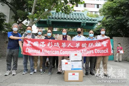 美国洛杉矶华人华侨联谊会捐赠防护用品。(美国《侨报》/邱晨 摄)