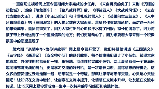 在丽水营,来自西班牙华文轩华侨子弟学校的李一帆校长对网上夏令营给予高度评价,他说:“在新一期网上夏令营里,不仅看到了老朋友,更看到了新面孔,这表明夏令营的参营人数在不断的扩大,也充分说明了网上夏令营的成功”“在疫情阴霾笼罩全球的情况下,网上夏令营便是侨联送来的最好的‘药剂’”“网上夏令营不仅给了营员们一次了解祖(籍)国、认识祖(籍)国的机会,也给了海外华侨团结起来的机会”。他代表校方对中国侨联表示感谢,并和大家分享了参加网上夏令营的经验和收获。