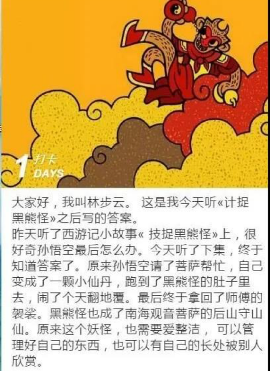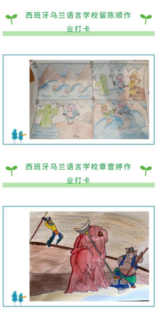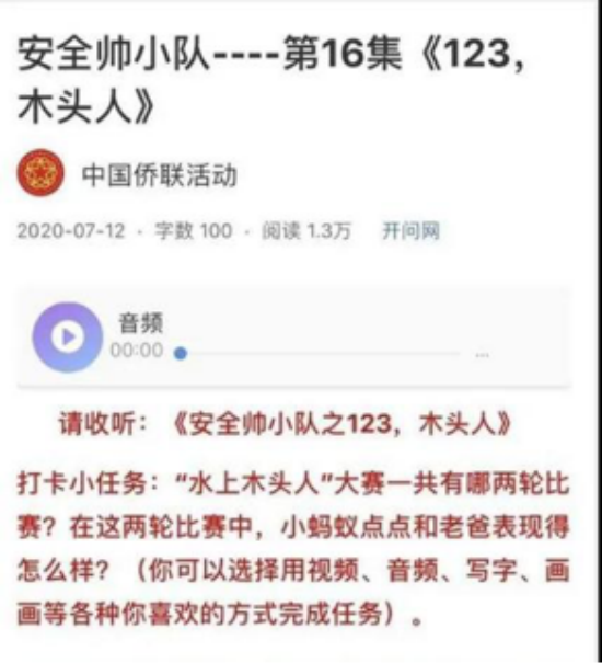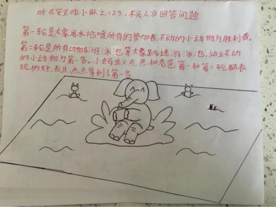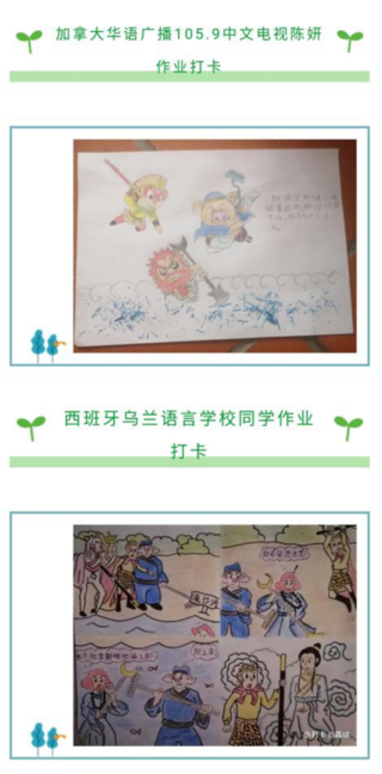 网上夏令营开营后,各班老师布置了作业,让华裔青少年最感兴趣的故事是《123,木头人》,大家通过听音频后,用听、说、读、写、画等方式出色地完成了打卡作业。