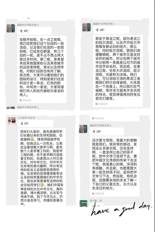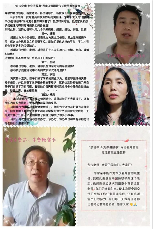 一路走来,营员家长和老师一起见证了孩子们的成长与进步。闭营式上,他们分享了孩子们的收获,15天的网上夏令营活动,孩子们在感受快乐的同时,中文水平也在逐步提高,他们对中国的人文地理有了更深刻的了解,也领略到了华夏历史的悠远和浑厚的积淀。孩子们还在云端游览黑龙江,了解黑龙江的风土人情,通过这次活动,孩子们爱上了中国,爱上了黑龙江,他们向往实地体验黑龙江的文化,欣赏黑龙江的美景,品尝黑龙江的美食。