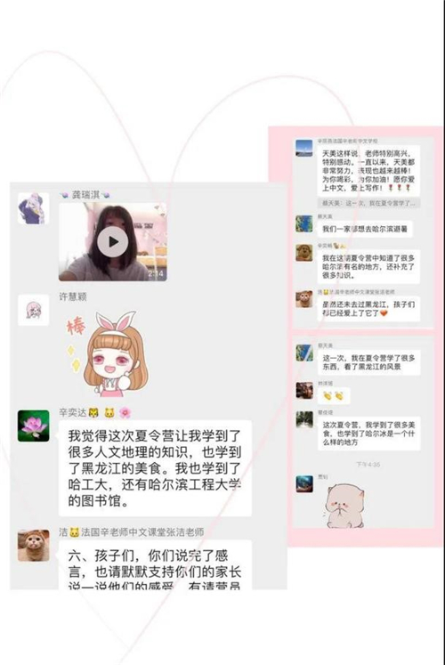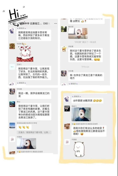 法国辛老师中文课堂负责人辛丽燕老师在视频发言中感谢中国侨联、黑龙江省侨联以及黑龙江外国语学院为孩子们提供了一次寄情山水,领略大美龙江的机会。她带着我们一起回顾了整个夏令营期间那些难忘的惊艳时光。