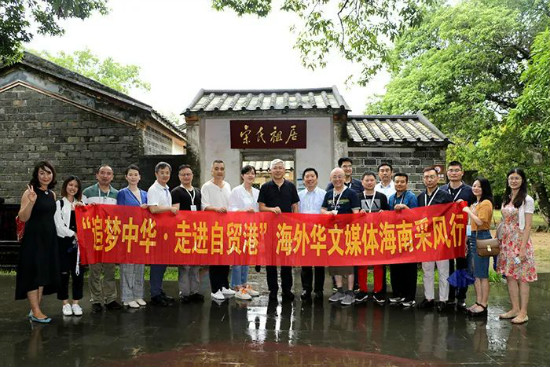 “追梦中华·走进自贸港”海外华文媒体海南采风行在文昌宋氏祖居考察并合影(陈苏琤 摄)