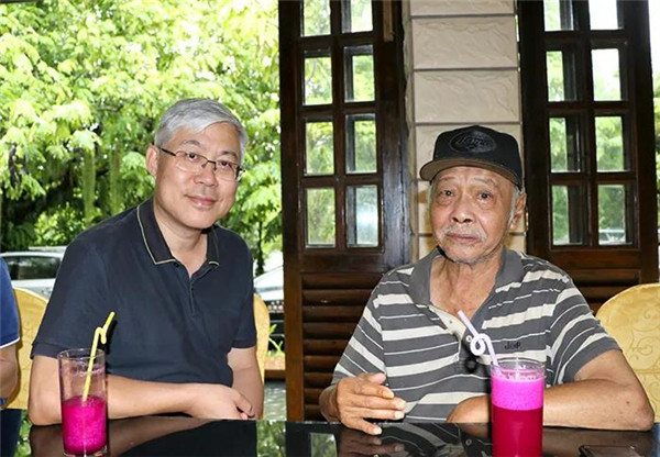 中国侨联信息传播部部长左志强(左)与印尼归侨、兴隆热带花园创建人郑文泰先生(右)交谈(陈苏琤 摄)
