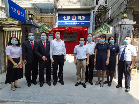2020年11月3日上午,永庆坊涉侨纠纷调解室揭牌仪式在广州市荔湾区多宝街司法所举行。广州市侨联副主席林瑞琪,荔湾区委常委、政法委书记黄红闯,区法院院长姚义堂、区司法局局长温盛发,区侨联主席彭爱玲,多宝街司法所所长朱斌共同为调解室揭牌。