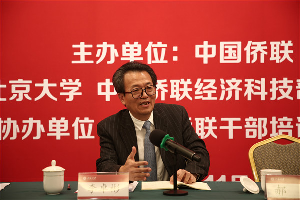 郝平校长在讲话中谈到,华侨华人在每个重要的历史节点,在祖国每个困难的时刻,都有广大华侨华人的身影,都作出了不可磨灭的贡献。尤其是改革开放初期,华侨华人踊跃回国投资创业,投资比例占到了中国引进外资的60%以上。中国侨联能选在北大举办本期研修班,各位侨领代表能来北大学习,我们感到非常荣幸。他向各位学员简单介绍了北京大学作为中国第一所国立综合性大学的创校历史和辉煌历程,并向学员提出三点希望: