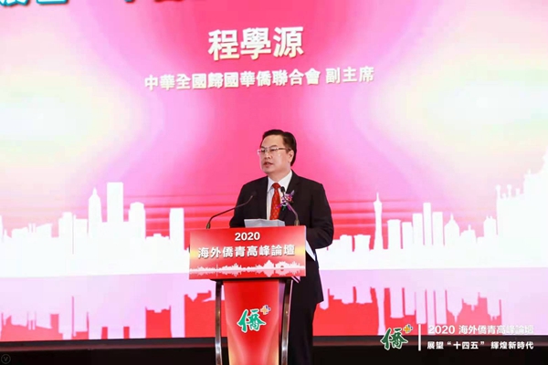 展望“十四五”· 辉煌新时代——2020海外侨青高峰论坛由中国侨联和澳门归侨总会共同主办,中国侨联青年委员会和澳门侨界青年协会共同承办,来自20多个国家和地区的260余名侨界各业界菁英和青年共襄盛事。程学源在论坛上致辞,并与中央政府驻澳门联络办公室副主任张荣顺、澳门外交公署署理特派员王冬、澳门贸促局主席刘伟明、澳门归侨总会会长刘艺良等嘉宾共同主礼。