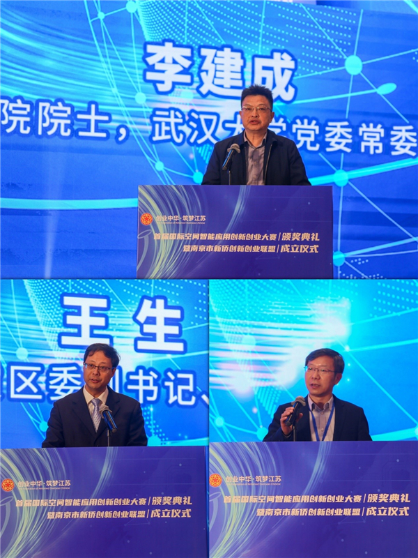 李建成代表空间智能专业的专家致辞,希望各位参赛者以大赛为纽带,让世界空间智能专业的朋友们深入交流,早日促成创新项目落地生根、成功转化。王生代表南京市栖霞区委、区政府致欢迎辞,戴跃伟宣布大赛获奖名单。
