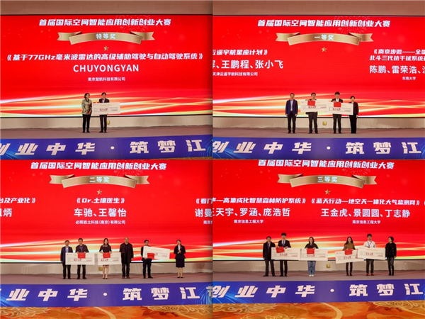 据悉,创业中华·筑梦江苏——首届国际空间智能应用创新创业大赛自开赛以来,得到了江苏省、南京市有关厅局,海内外高校,侨界创业人才,智能空间领域企业的大力支持。大赛历时两个多月,共收到报名项目79个,其中企业赛道30家,高校赛道49家。参赛项目中,既有海外高校直接报名参加,也有海外归国人才团队参与。经过项目资格审查和初赛两轮筛选,12个项目进入决赛。通过激烈角逐,最终《基于77GHz毫米波雷达的高级辅助驾驶与自动驾驶系统》项目荣获特等奖,《云遥宇航星座计划》和《南京步微-全国首创的北斗三代抗干扰系统开拓者》2个项目荣获一等奖,《基于5G的“航空+”AI智能化平台及产业化》《Dr.土壤医生》《看门狗-智慧社区》3个项目荣获二等奖,《苍穹地质灾害综合防治信息管理平台》《山知声-高集成化智慧森林防护系统》《蓝天行动-地空天一体化大气监测网》《交通之眼-雷达视频复合交通监测技术的领航者》4个项目荣获三等奖。