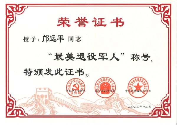 此项荣誉由中央宣传部、国家退役军人事务部、中央军委政治工作部共同授予。这三个单位近日在北京举行了“闪亮的名字--2020年度最美退役军人发布仪式”,决定授予邝远平等18人及两个群体“最美退役军人”称号。