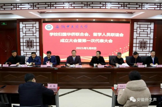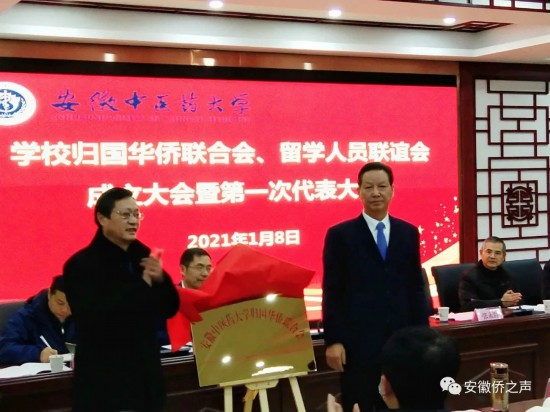 2021年1月8日下午,安徽中医药大学归国华侨联合会、留学人员联谊会成立大会隆重召开。安徽省侨联党组书记、主席李世蕴,安徽中医药大学党委副书记张永群出席会议、讲话并共同为安徽中医药大学归国华侨联合会揭牌,安徽欧美同学会秘书长许松亭、省委教育工委组干处副处长王树龙出席会议讲话并共同为安徽中医药大学留学人员联谊会揭牌。安徽中医药大学党委常委、组织部部长武刚,党委常委、校党委办公室主任聂久胜及学校归国华侨联合会、留学人员联谊会代表参加会议。安徽中医药大学党委常委、宣传统战部部长罗绍明主持会议。