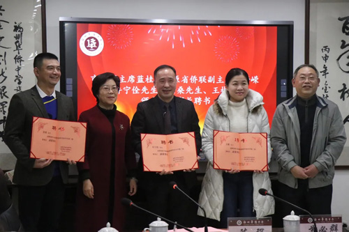 福州市侨联蓝桂兰主席、省侨联原副主席杨峥嵘向许宁佺先生、金桑先生、王彬女士颁发副董事长聘书