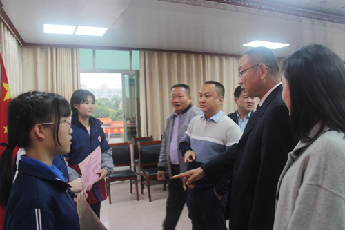 梧州市侨联主席吕春松(左二)与受助学生交流