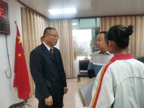 梧州市侨联主席吕春松(左一)与受助学生交流