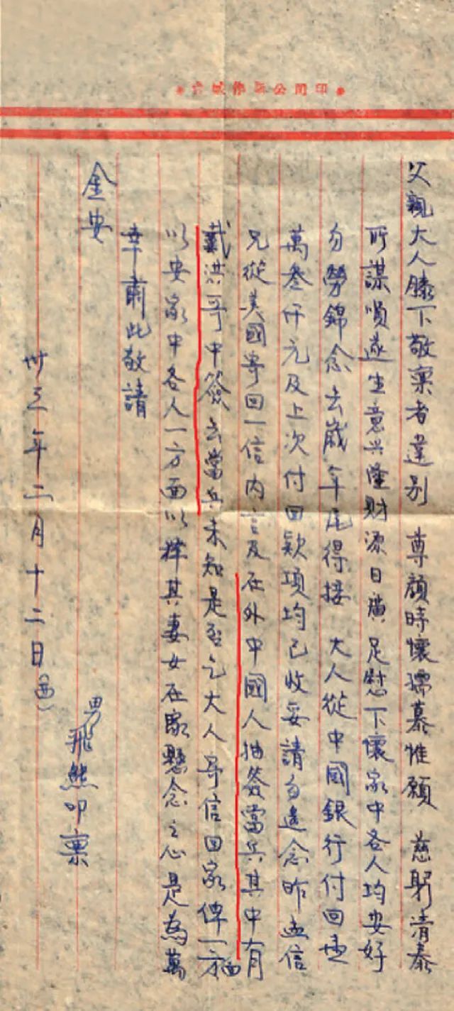 敬禀者,违别尊颜,时怀孺慕,惟愿慈躬清泰,所谋顺遂,生意兴隆,财源日广,足慰下怀。家中各人均安好,勿劳锦念。去岁年尾,得接大人从中国银行付回壹万叁仟元及上次付回款项均已收妥,请勿遥念。昨孟信兄从美国寄回一信,内言及在外中国人抽签当兵,其中有戴洪哥中签去当兵,未知是否,乞大人寄信回家,俾一方面以安家中各人,一方面以释其妻女在家悬念之心,是为万幸,肃此敬请。