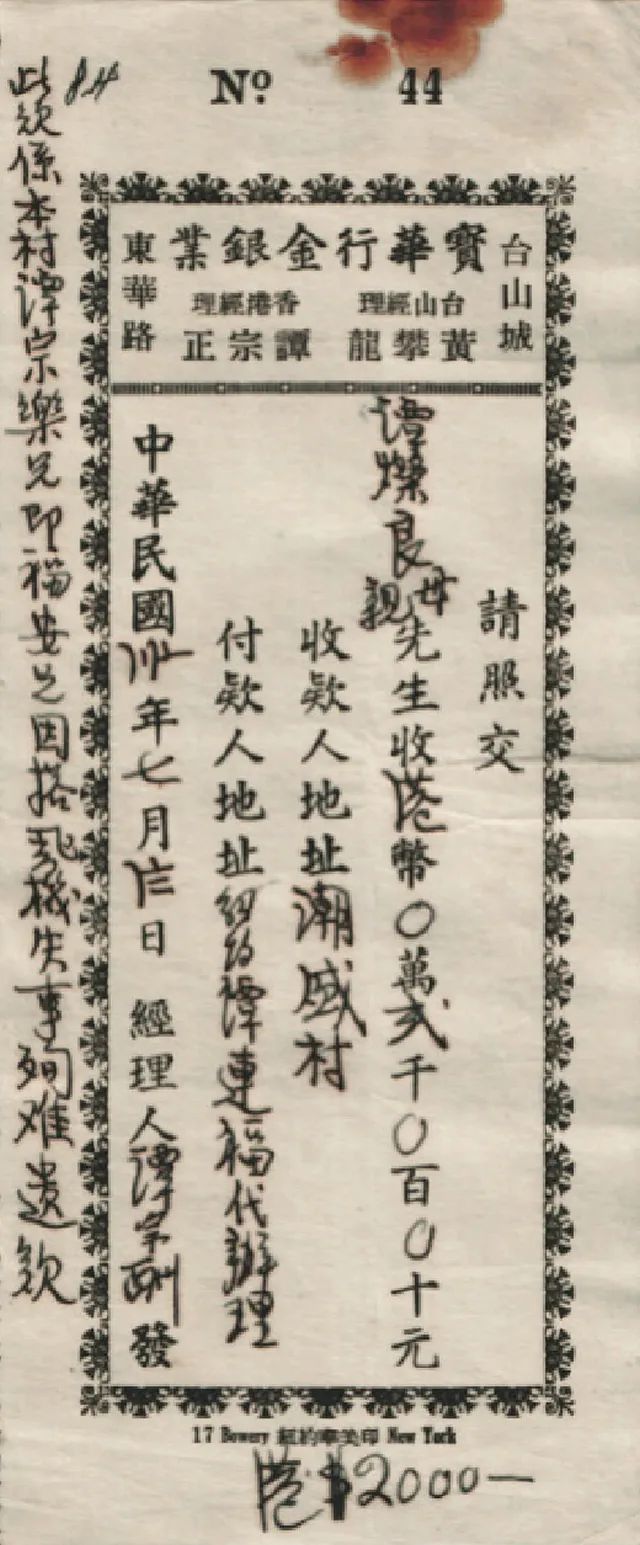 这里我收集到的一封空难侨批,记下了侨乡儿女最悲壮的一幕。这是一封台山城“宝华行金银业”接驳的格式化侨批,1947年7月18日由纽约谭连福代理汇出,经香港接驳,8月4日寄到台城宝华行转交潮盛村谭灿良母亲收,批银2000元港币,全程耗时只16天。批单左侧写上一行字“此款係本村谭宗乐兄即福安兄因搭飞机失事殉难遗款”,由此可知,这位谭宗乐就是抗战时期飞机失事的死难者。抗战胜利后,香港这个五邑侨批交通枢纽恢复运转,汇路接通,他留在美国的遗产由同村兄弟谭连福寄回给家乡的遗孀。批单上简短的一行字,使读者心酸落泪,可歌可泣,可谓“春蚕到死丝方尽,蜡炬成灰泪始干。”