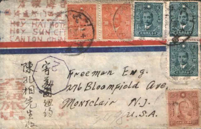 这是一封抗日战争期间从台山寄往美国的回批信,封面贴孙中山像邮票6枚,邮资合计16.6元法币,盖红色“台山城西门墟通济路台海旅店”(民国时期是兼营侨批业务的机构)章,1944年2月12日销台山邮局戳挂号寄出,由步差2月28日送至桂林,再经重庆,乘搭驼峰航线飞机,经过印度的加尔各答,盖上印度八角型2号检查戳,再经英军检查后乘英国海外航空运至尼日利亚之拉哥斯,经南美巴西转运抵美国迈阿密,然后送抵美国,4月25日到达美国纽约邮局,4月26日交到收信人手里,全程耗费74天时间。