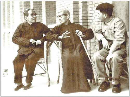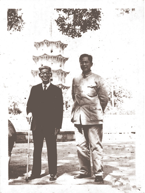 1965年,李光前先生在新华楼前与时任国光中校校长郑明端(右一)、副校长伍远资(左一)亲切会谈