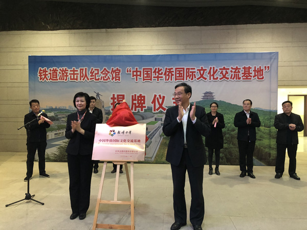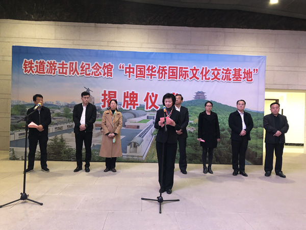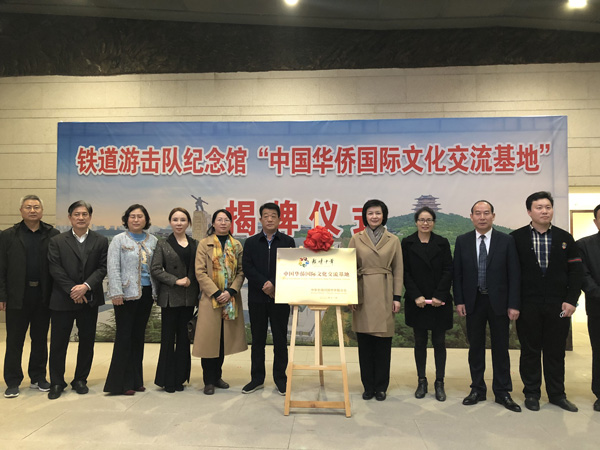 3月10日,中国华侨国际文化交流基地—铁道游击队纪念馆举行揭牌仪式。山东省侨联党组成员、副主席米文芃,枣庄市副市长邵士官,枣庄市侨联党组书记、主席王玉如,薛城区委副书记、区长伊作义参加活动,薛城区委常委、统战部长孙中坤主持活动。