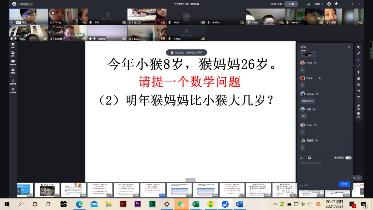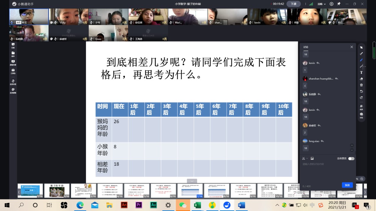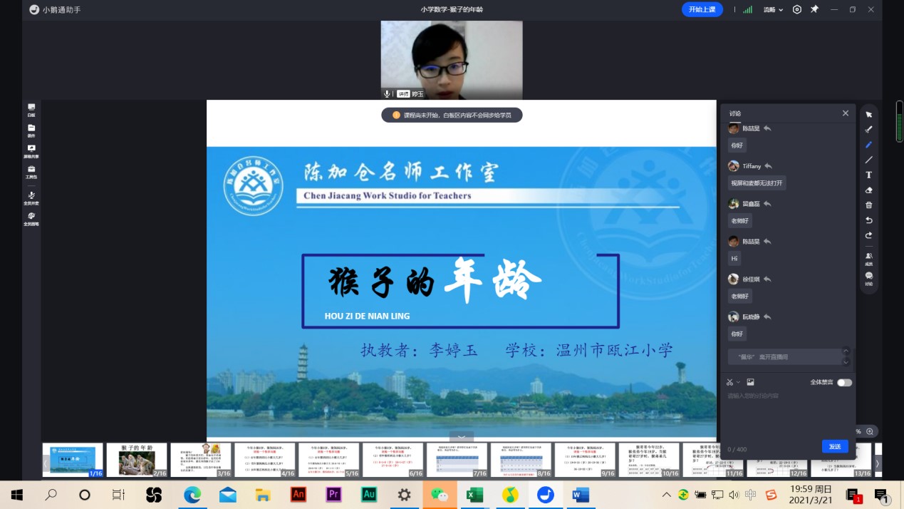 北京时间2021年3月21日晚上八点,浙江华侨网络学院2021年春季课程小学数学之“猴子的年龄”于线上正式开播。本次课程由陈加仓名师工作室李婷玉老师执教,受到孩子家长们的热烈欢迎。