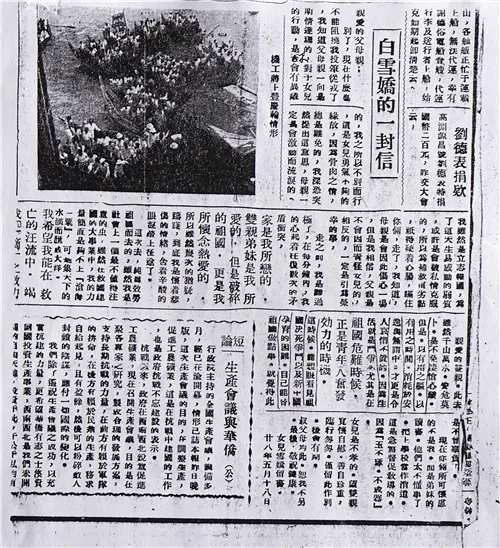 她的这封家书在《光华日报》《南洋商报》等当地知名媒体刊发,这些报纸还专门采访她,登载了《中华好儿女,协和女教员白雪娇亦上前线》等报道,报道配发的照片上,白雪娇戴着近视眼镜,穿着中式旗袍,青春美丽。