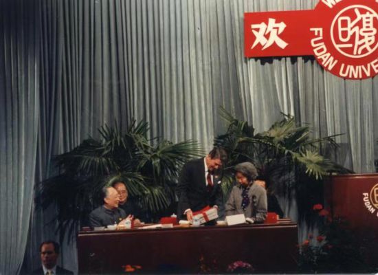 与此同时,谢希德还注重请进名人与复旦师生面对面交流。她任复旦校长期间,复旦大学曾授予日本著名物理学家茅诚司、诺贝尔奖获得者杨振宁等著名专家学者复旦大学名誉博士的学位,接待美国总统里根、巴西吉马良斯议长等国家级领导人来访。通过这样的外事活动,不仅让复旦师生有机会直面学术大师、政要名人,也加强了复旦与国际的联系,极大地提升了复旦的国际知名度。