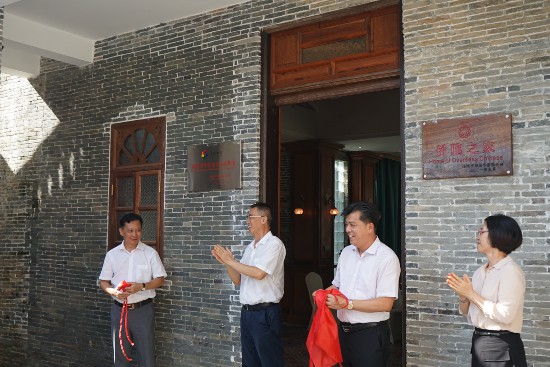 陆志远(左二)、黎才旺(左一)、邓玉妹(右一)、吴坚强(右二)共同为“海南省华侨文化交流基地”和琼海市“侨胞之家”揭牌