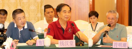南华时刊总编辑曾海声(左),新加坡侨眷钱汉堂(中),日本海南总商会会长符明潮(右)在座谈会上分享体会