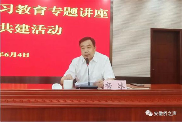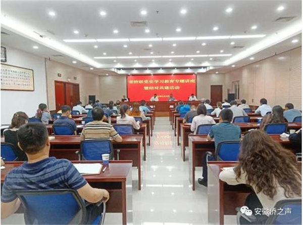 6月4日下午,安徽省侨联组织开展党史学习教育专题讲座暨结对共建活动,邀请省新四军历史研究会学术委员会主任、省委党史学习教育宣讲团成员、省新四军历史研究会宣讲团副团长聂皖辉作《学习百年党史 坚定“四个自信”》专题讲座,省侨联党组书记、主席李世蕴,省新四军历史研究会副会长、省新四军历史研究会党史宣讲团副团长陈卫东出席活动,省侨联党组成员、专职副主席兼秘书长杨冰主持。省新四军历史研究会副秘书长李茂辉、汪哲夫,省侨联党组成员、办公室主任毕清,省侨联退休老同志,省侨联机关干部职工,合肥市、部分县(区)侨联干部,省侨商联合会、省侨商企业党建联盟等单位相关人员约60余人参加党史学习教育专题讲座。