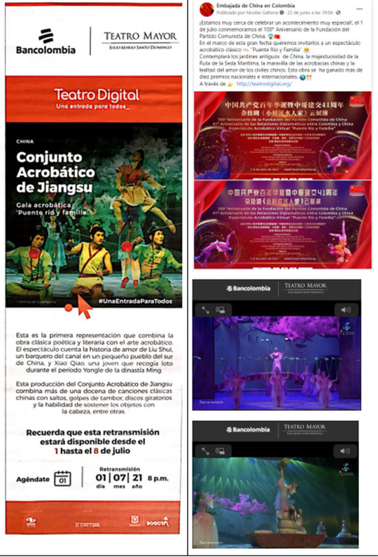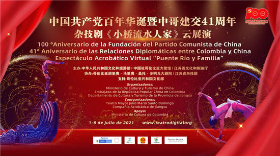 7月1日-8日,“江苏省华侨文化交流基地”江苏省杂技团在南美洲哥伦比亚世界著名的圣多明戈大剧院,成功举办经典杂技剧《小桥流水人家》云展演。中国驻哥大使蓝虎,哥文化部长安马尤洛(Angélica Mayolo),哥首任文化部长、大剧院院长奥索里奥(Ramiro Osorio)分别为云演出视频致辞。哥各界民众与世界各地近220万观众和粉丝,欢聚“云中”,共庆中国共产党百年华诞。