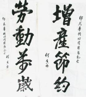 图2:1953年,何香凝为印尼华侨球队题字《增产节约》、《劳动光荣》