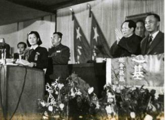 1949年9月27日,马来亚归侨黄薇于全国政协一届会议上向毛泽东、朱德献锦旗。