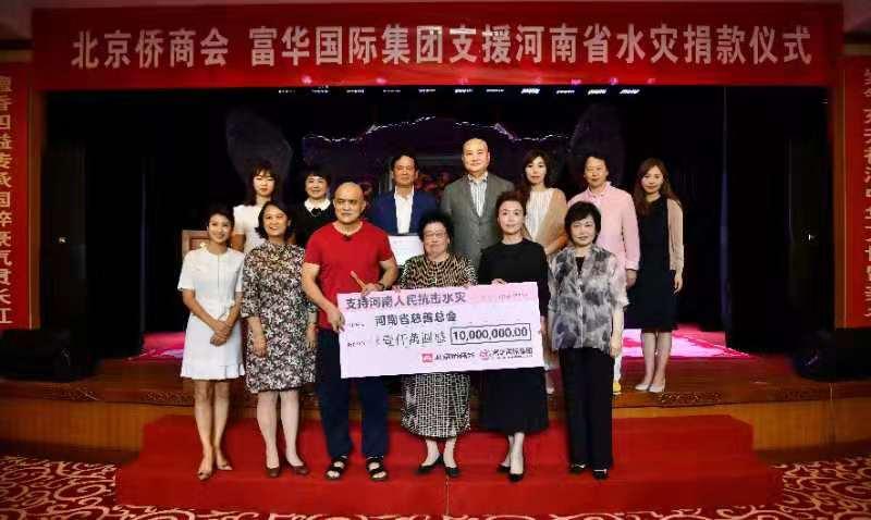 7月30日,中国侨商联合会荣誉会长单位、富华国际集团向河南灾区捐款仪式在中国紫檀博物馆举行。中国侨联副秘书长、经济科技部部长赵红英,河南省驻京办副主任孙兰红,中国侨商联合会荣誉会长、富华国际集团董事局主席陈丽华,中国侨商联合会常务副会长、富华国际集团总裁赵勇等出席捐款仪式。