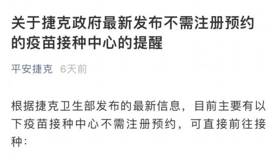 据中国驻捷克大使馆网站消息,日前,根据捷克卫生部发布的最新信息,目前主要有以下疫苗接种中心不需注册预约,可直接前往接种: