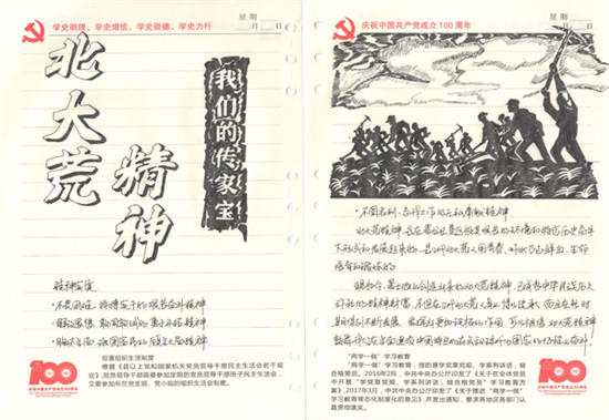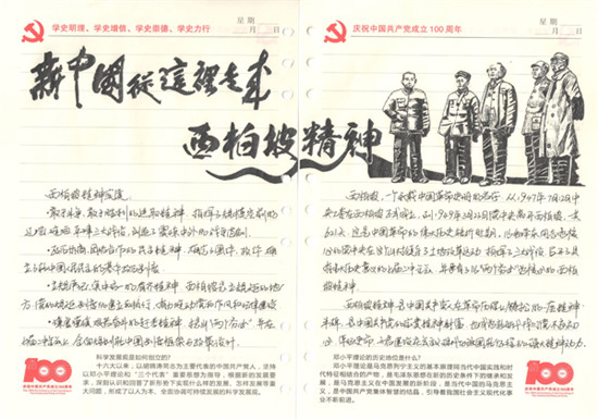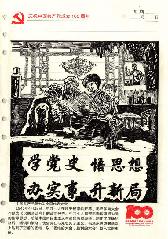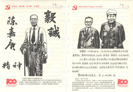 百年党史“画”出来。为使党史教育鲜活生动,走心入脑,市侨联组织了宣讲会、读书班、交流会,开展了“寻找精神坐标”系列主题党日,创作了歌曲《侨心向党》,拍摄了“庆七一”MV、海外华侨华人祝福党和祖国短视频合集,举办“同心筑梦”华侨华人书画作品展等富有侨联特点的系列活动。在整合组织资源的同时,还激发侨联干部潜能,用身边学习榜样助燃全员学习热情。机关干部赵治刚同志发挥绘画特长,以党史故事绘形式做学习笔记,用画笔描绘了100多幅革命领袖、英雄人物、重要战役、革命精神、辉煌成就等令人难忘和催人振奋的作品,并配有史实介绍和学习感悟。这些画作和侨联学习教育安排紧密结合,如组织参观杨连弟纪念馆后,创作了《英雄杨连弟》;参观市总工会“三种精神”展览后,创作了《天津劳模白方礼老人》;吉鸿昌外孙女讲将军主题报告会后,创作了《吉鸿昌将军》;观看影片《狼牙山五壮士》和《悬崖之上》后,创作了《狼牙山五壮士》和《吴石将军》;感念袁隆平老人去世,创作了《袁隆平老人画像》等等。生动、传神的画面和发自肺腑的感悟,使艰苦年代、历史场景、伟大精神跃然纸上,起到了强化记忆、激发共鸣、深化意义、催生责任的作用。