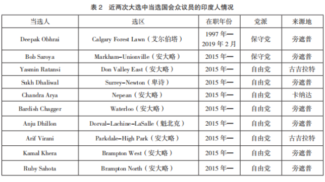 首先,当选人数创历史新高,二者“代表权鸿沟”凸显。2015年,有21名印度人当选国会议员,占少数族裔议员总数的45%和全部国会席位的6.2%。2019年,当选人数增至22名,占国会席位的6.5%,呈现“超比例代表权”的特征(见表2)。其中,4 位被提名为部长,职位最高的当属国防部长石俊(Harjit Sajjan)。华人也积极投身于选举之中,2019年,有8名候选人当选,较上届多出2人,创造了华人参政的新纪录。与以往相比,华人参政出现可喜变化。然而,华人参政水平与其人口规模和经济实力仍不相称,如果按人口比例计算,加拿大国会中至少应有17名华人议员,目前连一半都不到。“内阁中偶尔涌现的个别华人部长,多是政党胜出的大势和内阁多元比例要求的结果,在边缘化位置上难以有所作为。”