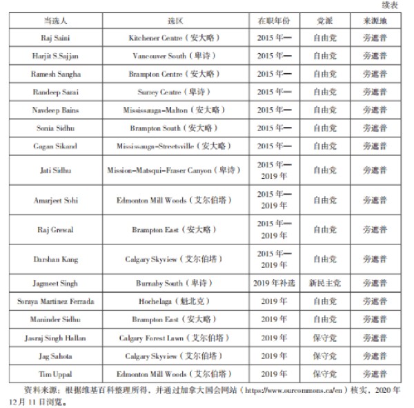 再次,参选失败率较高,参政群体分布不均衡。虽然华人和印度人参政热情不断高涨,参选人数屡创新高,但是,参选落败的比例远高于成功当选的比例。在最近两次大选中,华人参选失败率约为80%,印度人亦有70%~75%,这与参选人集中在族裔人口聚集的选区不无关系。在华人和印度人次群体中,中国香港移民和印度旁遮普邦的锡克人参政成效明显。在当选华人中,一半为香港移民,而占全加总人口仅1.4%的锡克人获得了19个国会席位和3个内阁职位。中国大陆新移民和印度古吉拉特邦的参选人数亦有增加,但成功者仅3位,分别是董晗鹏、阿里夫·维拉尼(Arif Virani)和亚斯名·拉坦西(Yasmin Ratansi)。