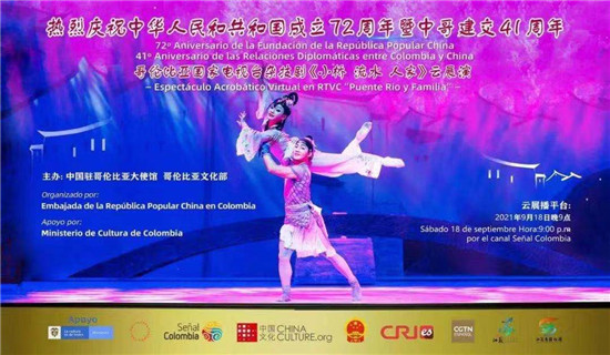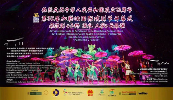 9月18日晚黄金时间,中国驻哥伦比亚大使馆和哥伦比亚文化部,联合在哥伦比亚国家电视台、第32届加勒比国际戏剧节开幕式上,共同举办“江苏省华侨文化交流基地”江苏省杂技团创作的杂技剧《小桥流水人家》国庆系列云首演,掀开了中华人民共和国成立72周年暨中哥建交41周年系列献礼活动。CGTN西班牙语部、中国文化网等中哥机构和媒体的电视端、官网及YouTube、Facebook等新媒体账号同步播出。中哥各界民众与加勒比地区26万观众和粉丝,欢聚云中,好评如潮。