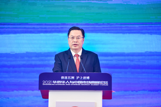 陈群在致辞中表示,广大华侨华人分布在世界各地,是推动中国与世界商贸往来、交往交流的重要力量。自2018年首届进博会举办以来,大家积极响应、踊跃参与,参展规模逐年扩大,参展效应不断显现,充分发挥了联通内外的独特作用,为助推上海服务构建新发展格局作出了积极贡献。本次论坛为大家搭建了良好的合作交流平台,希望各位嘉宾广泛对话、深入交流,共同探讨华侨华人与中国市场的合作共赢之路,为助力上海和中国实现高质量发展,为促进世界经济加快复苏作出更多新贡献。
