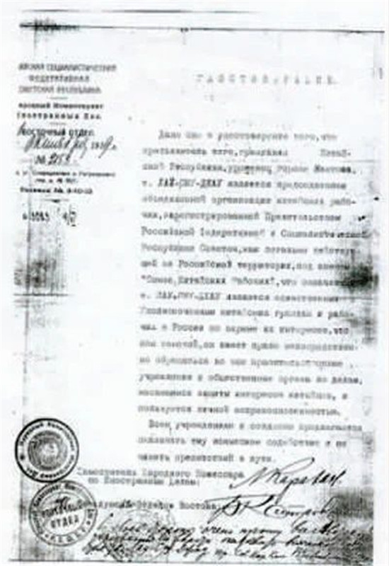 “兹证明本证书的执有者,中华民国公民广东籍人刘绍周同志,是经俄罗斯苏维埃社会主义联邦共和国政府登记为在俄罗斯领土内合法活动的‘华工联合会’的会长,唯一的由旅俄的中国公民和工人所授权为保护他们利益的人。该会长有权直接同一切政府机关和社会机构联系,以便办理有关保护中国人利益的事项,并且享有个人的不可侵犯权。希望一切机关和苏维埃对他予以各种协助以及在旅行途中予以方便。”