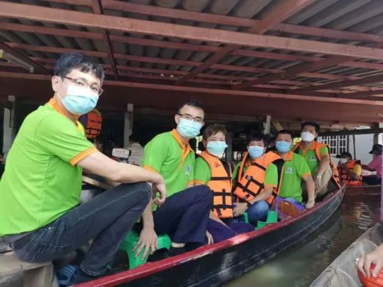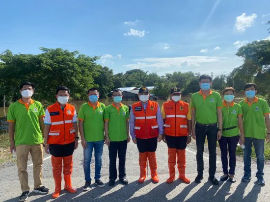 抵达信武里府时,府尹率当地官员迎接并带领救灾小组深入灾区。由于连日暴雨,路面积水超过一米,必须划船进入,期间各救灾人员也有趟着水走进去,洪水没过小腿,接近淹到人的腰部。