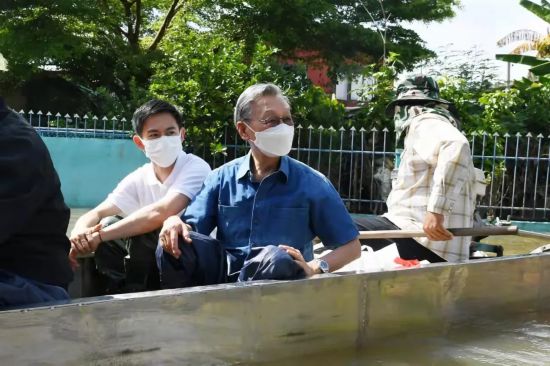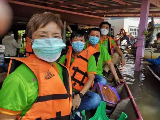泰国泉州晋江联合总会会长蔡上新、执行会长陈俞龙、副会长许清流、洪世界、张孚杰、常务理事黄淑芬、顾问许宗会乘小船进入灾区