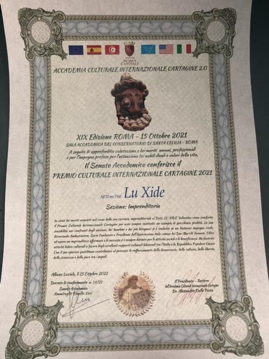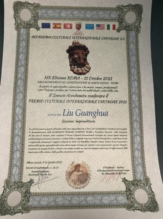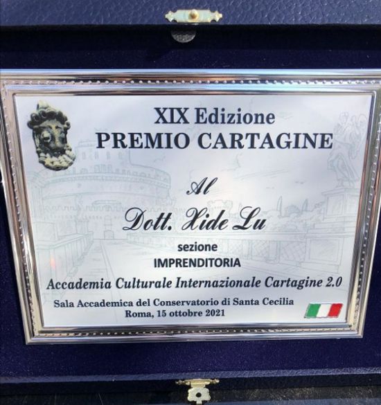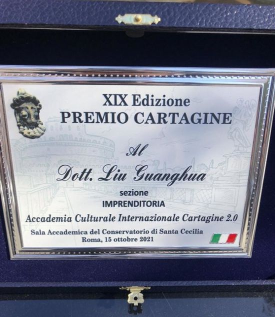 2021年10月15日,由意大利国际文化学院主办的第 19 届迦太基 2.0 国际文化奖颁奖典礼在罗马著名的圣西西利亚音乐学院大礼堂举行,来自意大利社会各界知名人士、政要机构、各国获奖代表出席了颁奖典礼。