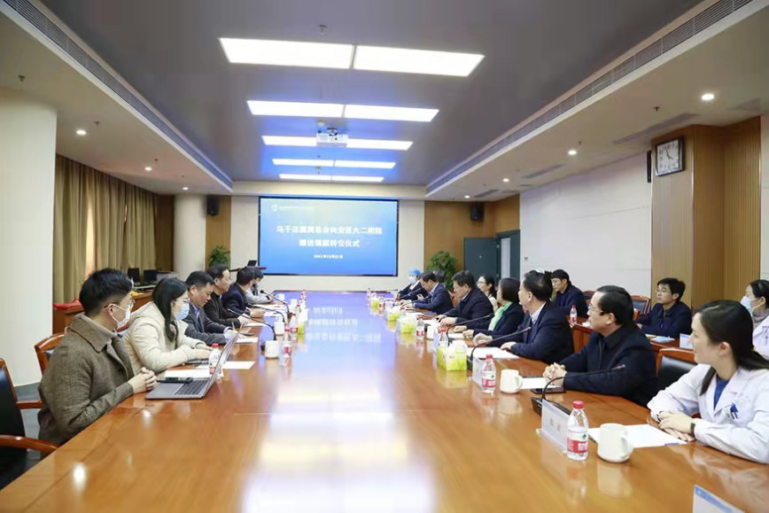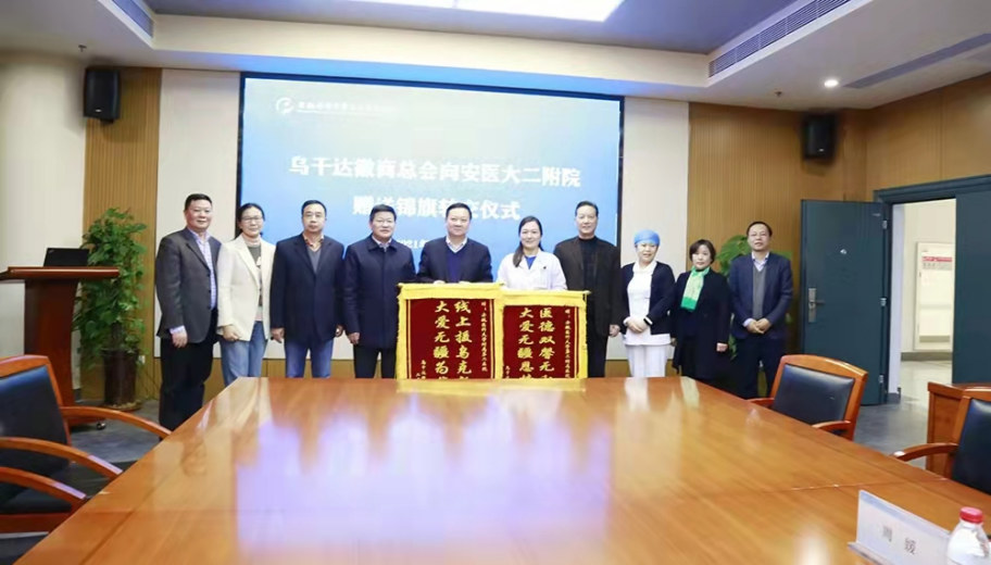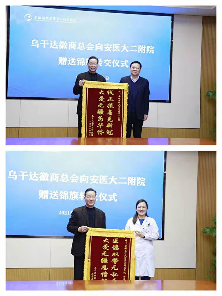 12月21日下午,安徽省侨联向安医大二附院转赠非洲乌干达侨胞“线上援乌克新冠·大爱无疆为华侨”锦旗。省侨联党组书记、主席李世蕴,安医大党委书记顾家山、安医大二附院党委书记周典出席并讲话,省侨联党组成员、专职副主席兼秘书长、一级巡视员杨冰主持转赠活动。