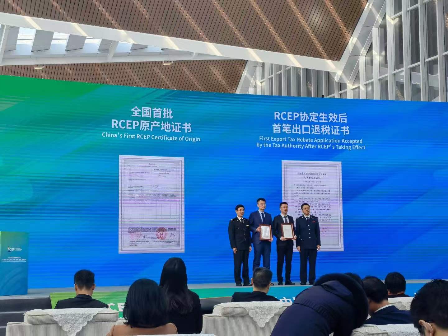 2022年1月1日上午,RCEP生效落地青岛启动暨“中国·山东·青岛-日本·关东·京滨”启航仪式在青岛市市北区邮轮母港客运中心举行。活动现场,青岛海关、市税务局分别颁出全国首份RCEP原产地证书、RCEP协定生效后税务机关受理首笔出口退税申请。