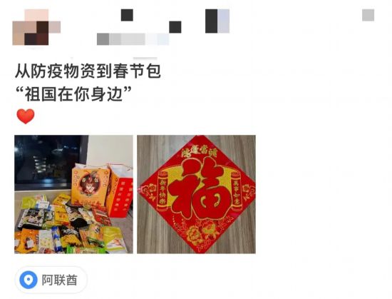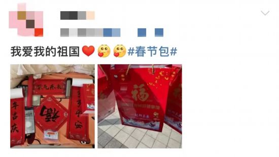 “春节包”年味儿十足,不仅有口罩等防疫物品,还有来自家乡的小零食、温情暖暖的慰问信以及应景的北京冬奥会明信片等。