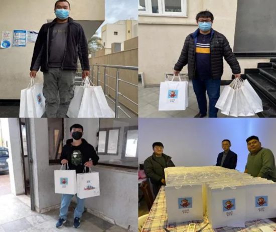 在蔚山务工的中国同胞也收到了备有口罩、耳罩、围脖、手套、面粉、糯米、油、方便面、桔子等物资的“春节包”。